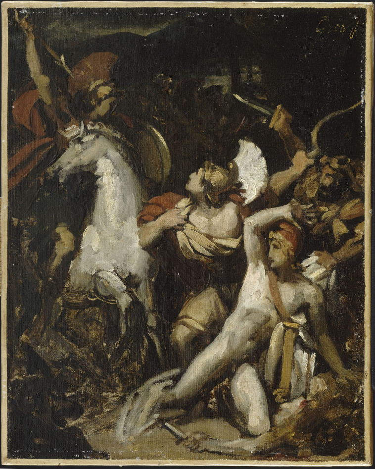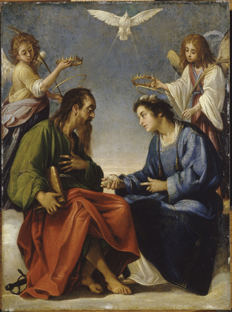 Saint Etienne et saint Paul conversant couronnés par deux anges