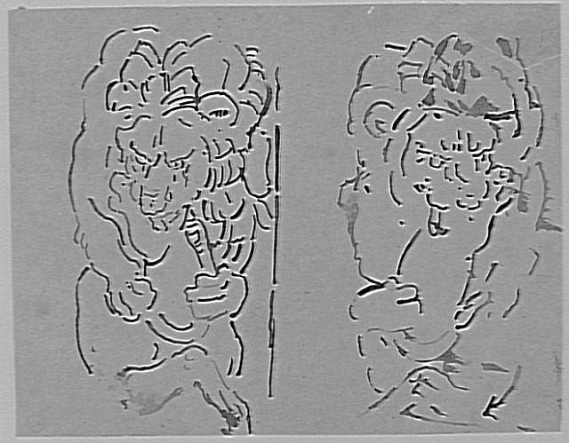 Carnet de dessins : deux lionnes assises, main tenant un objet